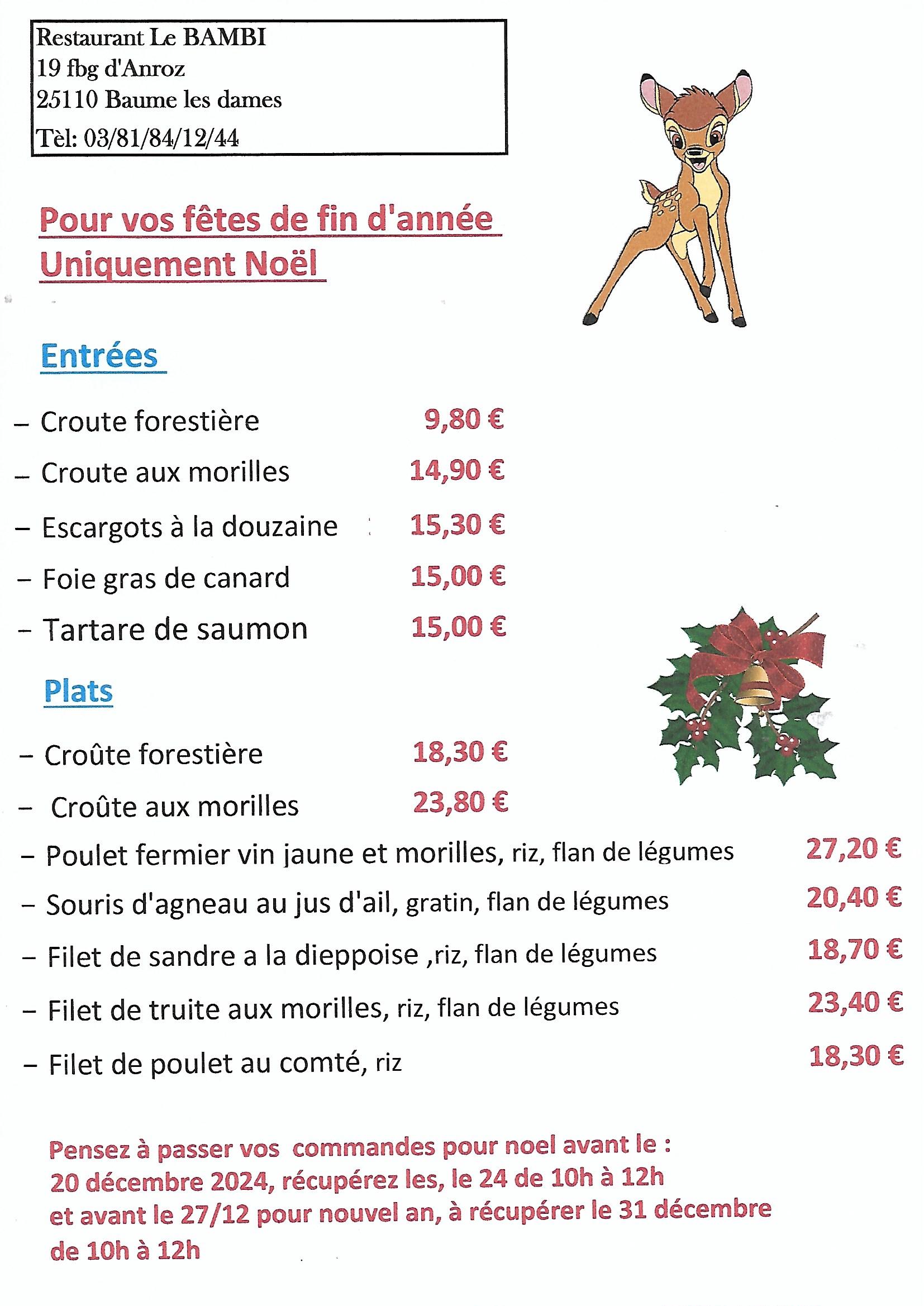 Situé à Baume-Les-Dames (25 Doubs, Franche-Comté), Le Bambi propose une cuisine traditionnelle faite maison à partir de beaucoup de produits locaux pour vous garantir la qualité et les saveurs du terroir.